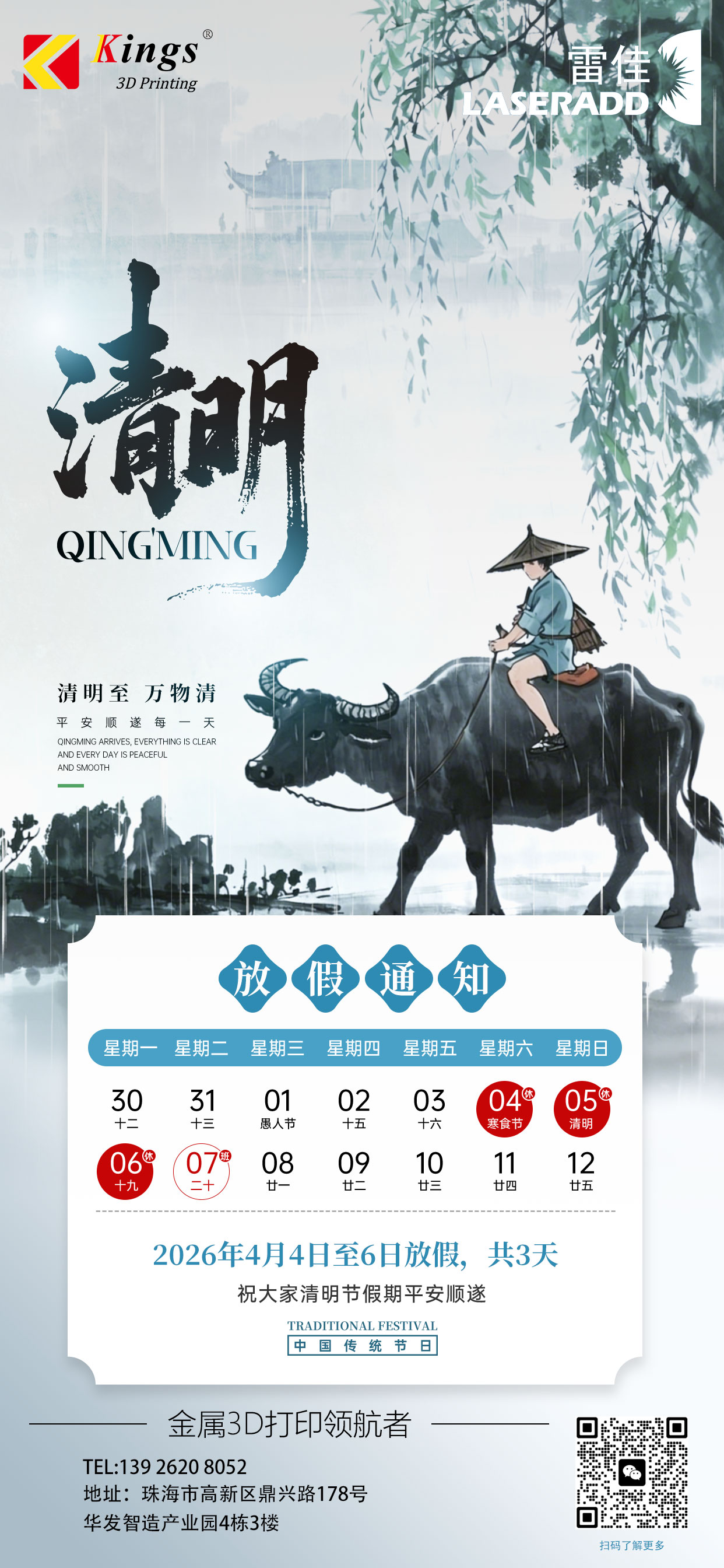 139 2620 8052根据国家放假安排,广东雷佳增材科技有限公司2026年清明节假期为4月4日(星期六)至4月6日(星期一),共3天,4月7日(星期二)起正常办公。
